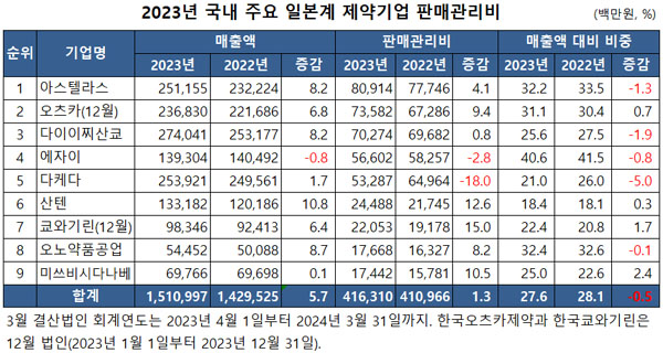 국내에 진출한 일본계 제약기업 9곳 중 7곳이 지난해 판매관리비(이하 판관비) 지출을 늘렸으나, 매출 증가로 인해 평균 판관비율은 전년보다 감소한 것으로 나타났다.