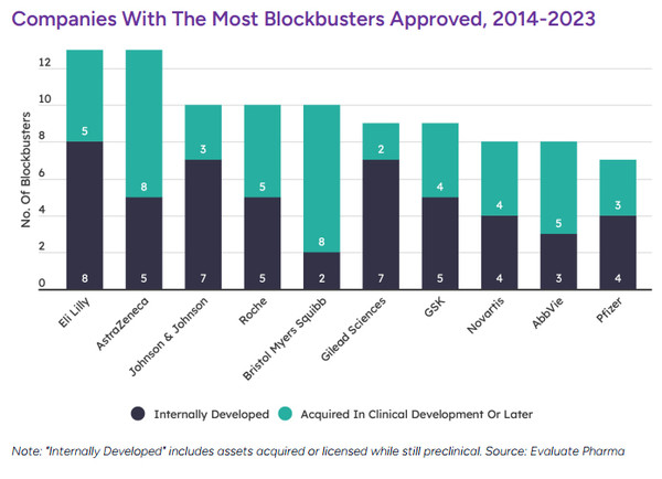 제약 분석회사인 이벨루에이트(Evaluate)가 2014~2023년까지 미국 FDA에서 승인된 487개 신약 중 연간 10억 달러 이상 매출을 기록했거나 예상되는 193개(39%) 약물을 분석한 보고서를 보면, 릴리와 AZ가 각각 13개 자산으로 공동 1위에 올랐다.