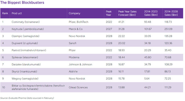 코로나19 관련 제품을 제외하면, 정점에서 한 해 동안 가장 많은 매출을 올릴 것으로 추정되는 5개 약물은 MS의 면면항암제 키트루다(Keytruda, 312.8억$), 노보의 항비제 위고비(222.2억$), 사노피/리제너론 파마슈티컬스의 면역질환 치료제 듀피젠트(200.2억$), J&J의 다발성 골수종 치료제 다잘렉스(Darzalex, 168.7억$), 애브비의 자가면역치료제 스카이리지(161억$) 등이다.