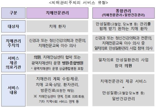 치매환자는 치매전문관리 서비스와 만성질환 및 전반적인 건강문제 관리까지 함께 제공하는 통합관리 서비스 중에서 선택해 신청할 수 있다.