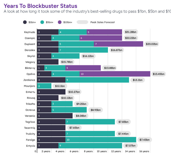 EP는 톱셀링 약물이 매출 10억 달러를 돌파하고 50억 달러, 100억 달러 브랜드로 성장하는 기간을 분석했다.