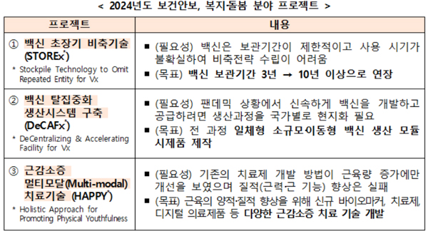 첫 번째 프로젝트는 ▲백신 초장기 비축 기술 개발, ▲백신 탈집중화 생산시스템 구축, ▲근감소증 멀티모달(Multi-modal) 치료 기술 개발이다.