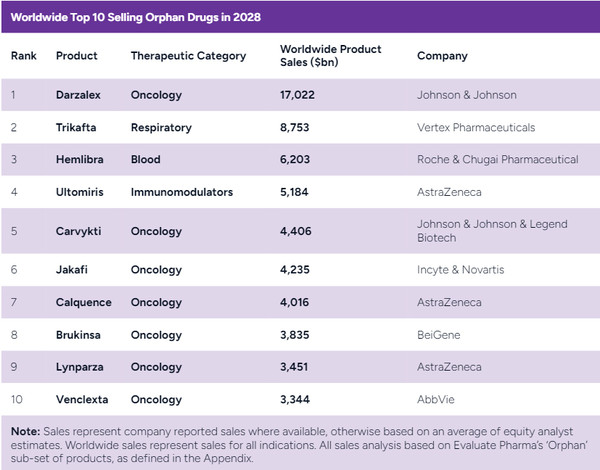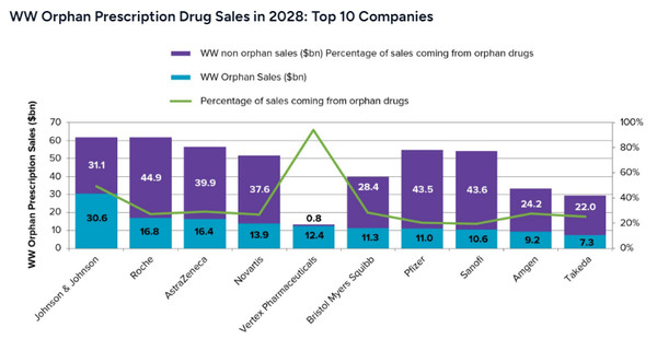 2028년, 희귀약물 매출 톱10 제약사의 순위는 일부 변동이 예상된다.