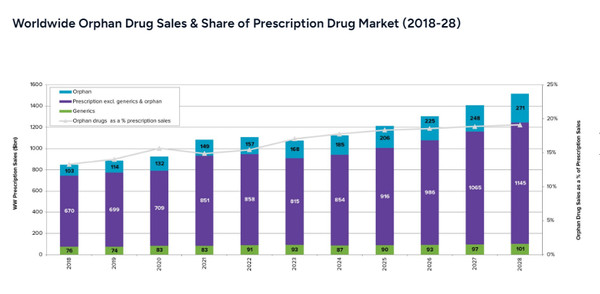 보고서에 따르면, 희귀약 시장은 2024년 1850억 달러, 2028년 약 2700억 달러로 성장할 전망이다.