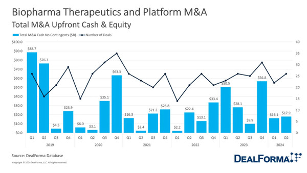 리서치 회사 딜포마(DealForma)에 따르면, 올해 상반기 동안, 시가총액 500억 달러 이상인 빅 파마가 발표한 17건의 거래 모두 50억 달러 이하로 평가됐다.