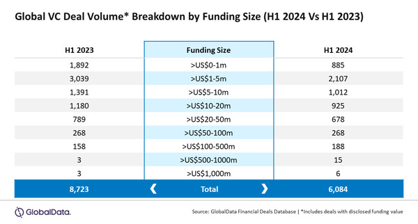 글로벌데이터가 올해 상반기 6084건의 VC 딜을 분석한 보고서를 보면, 1억 달러 미만의 낮은 가치의 거래가 지속적으로 시장을 장악하고 있다.