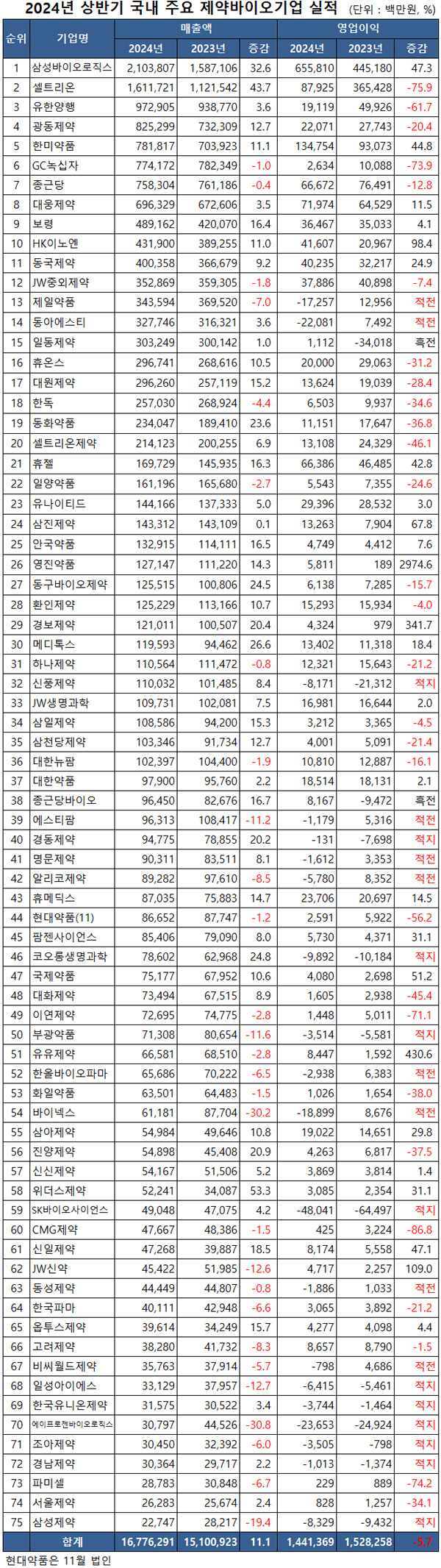 삼성바이오로직스는 반기매출 첫 2조원을 돌파했으며, 유한양행은 반기매출 1조원을 눈 앞에 뒀다.