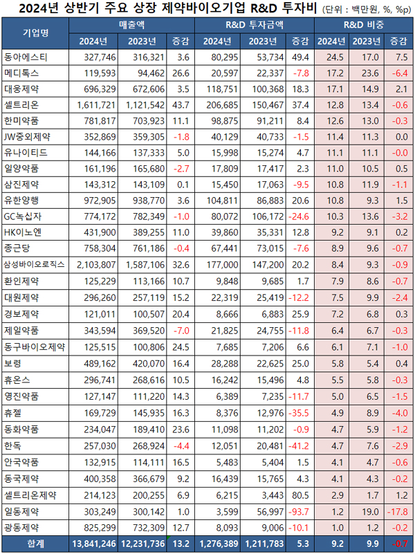 이는 2023년 상반기 R&D 투자비 증가율 12.7%와 비교했을 때 상당히 둔화된 수치다. 당시 30개사의 매출 증가율은 7.9%였다.