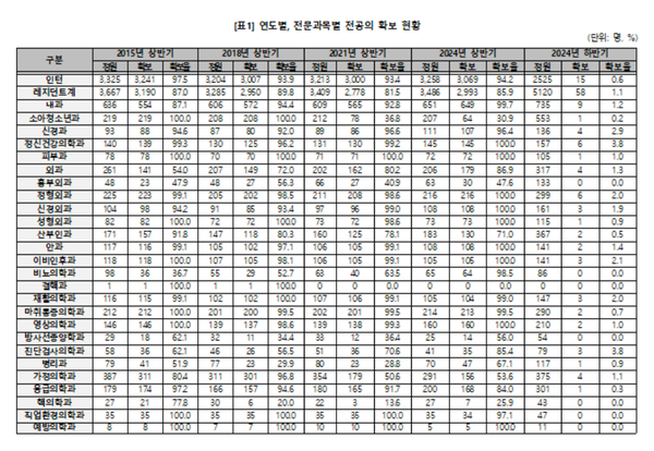 이와 함께 매년 90% 넘는 정원 확보율을 보이던 산부인과 조차도 2018년 80.3%에서 2022 년 68.9%로 거듭 하락했고, 올해 상반기에도 71%에 머물렀다.