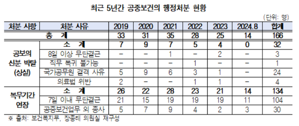 더불어민주당 장종태 의원이 보건복지부로부터 제출받은 국정감사 자료 ‘최근 5년간 공중보건의 행정처분 및 징계 현황’에 따르면 2019년부터 2024년 8월까지 행정처분을 받은 공중보건의는 166명, 징계를 받은 공중보건의는 176명으로 집계됐다.