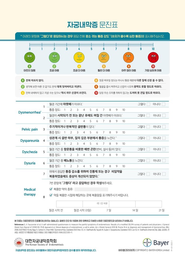 바이엘 코리아(대표이사 이진아, 이하 바이엘)는 대한자궁내막증학회와 공동으로 제작한 ‘자궁내막증 문진표’를 지난 29일 진행된 제15차 학술대회에서 최초로 공개하고 의료진들을 대상으로 배포했다고 4일 밝혔다.