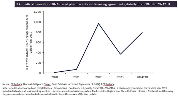 데이터 및 분석 회사인 글로벌데이터의 보고서를 보면, mRNA 기반 혁신 약물은 2019~2024년 현재까지 총 라이선스 계약 거래 가치가 800% 급등했다.
