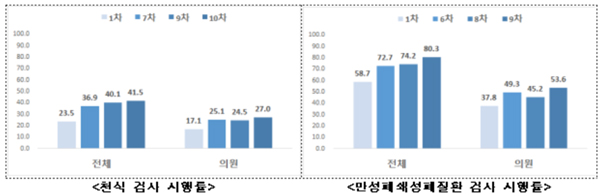 천식은 41.5%, 만성폐쇄성폐질환은 80.3%로 1차 평가 대비 각 18.0%p, 21.6%p 증가했다. 전체에 비해 의원의 검사 비율은 낮지만, 직전 차수와 비교 시 모두 증가했다.