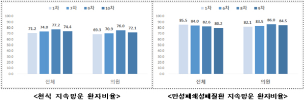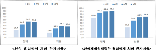 천식은 74.4%, 만성폐쇄성폐질환은 80.2%로 직전 차수 대비 각 2.8%p, 2.4%p 감소했고, 의원급도 모두 감소했다.