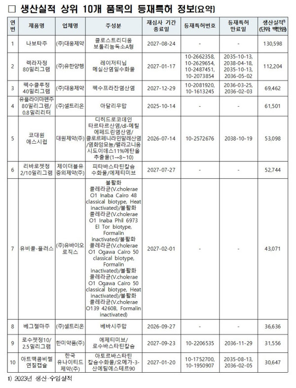 정보 공개 의약품 생산실적 상위 10위에는 ▲유한양행의 비소세포폐암 치료제 '렉라자정(성분명 레이저티닙) ▲대웅제약의 위식도역류질환 치료제 '펙수클루정(성분명 펙수프라잔) ▲한미약품의 고지혈증 치료제 '로수젯정(성분명 로수바스타틴+에제티미브) ▲JW중외제약의 '리바로젯정(성분명 피타바스타틴+에제티미브) 등이 있다.