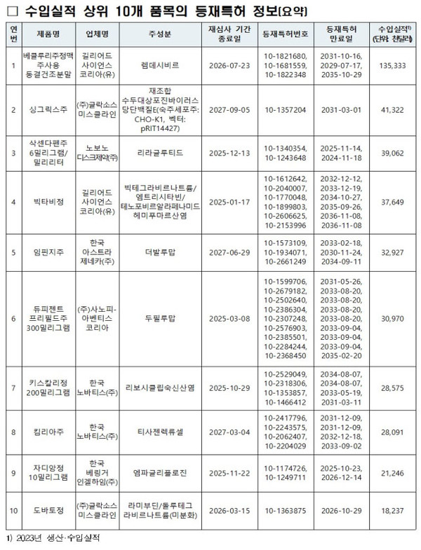 수입실적 상위 10개 품목에는 ▲길리어드의 코로나19 치료제 '베클루리주(성분명 렘데시비르)' ▲GSK의 대상포진백신 '싱그릭스주(성분명 재조합 수두대상포진바이러스 당단백질E) ▲노보노디스크의 비만치료제 '삭센다펜주(성분명 리라글루티드)' ▲길리어드의 HIV 치료제 '빅타비정(성분명 빅테그라비르나트륨+엠트리시타빈+테노포비르알라페나미드헤미푸마르산염) 등이 있다.