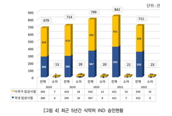 실제 최근 5년간 식약처 임상시험계획 승인현황을 분석한 결과, 전체 IND 승인 건수는 3745건이었으며, 소아대상 IND 승인 건수는 105건으로 전체 승인 건수 대비 2.8%밖에 미치지 못했다.