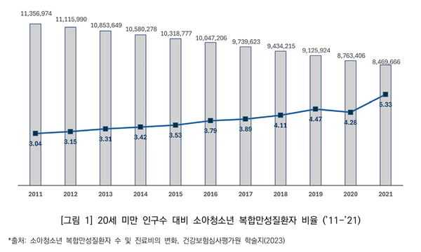 심사평가원 자료에 따르면 소아청소년 복합만성질환자수는 2011년 34.5만 명에서 2021년 45.1만 명으로 10.6만 명으로 증가했다.
