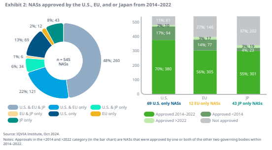 545개 신약 중, 48%(260개)는 미국, EU, 일본 등 세 규제 기관 모두에서 승인됐다.