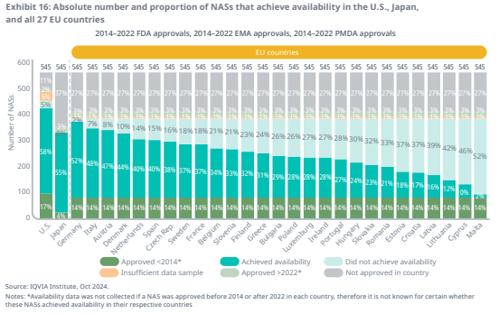2014~2022년, 미국에서 승인된 신약 5개 중 1개(83개/380개)는 EU에서 승인받지 못했고, 약 절반(185개/380개)은 일본에서 승인되지 않았다.