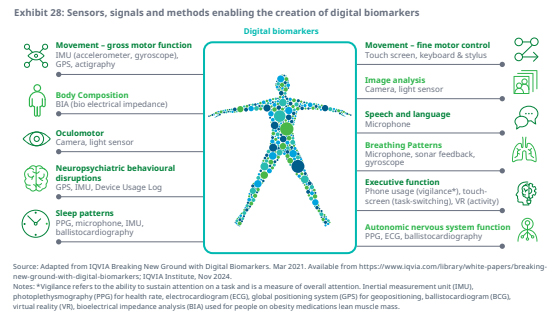 이런 도구의 대부분은 질병의 존재와 관련된 디지털 측정값을 수집하는 센서 기반 장치로부터 데이터를 분석하는 반면, 다른 것은 디지털 성능 평가를 수행하거나 환자의 건강 상태에 대한 단서를 산출하기 위해 환자가 보고한 데이터 또는 빅데이터를 분석한다.