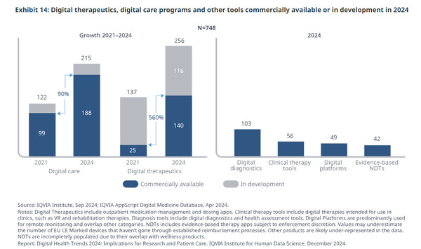 IQVIA에 따르면, 이런 치료 솔루션의 가용성은 2021년 이후 상업적으로 이용 가능한 처방 디지털 치료제의 수가 5배, 시판되는 디지털 치료 프로그램의 수가 약 2배로 증가 이후 급증했다.