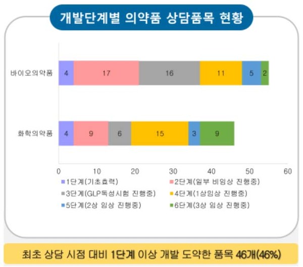 최근 3년간 의약품, 의료기기 사전상담 받은 품목을 분석한 결과, 이중 평균 약 58%의 품목이 개발단계 진전이 있는 것으로 확인됐다.