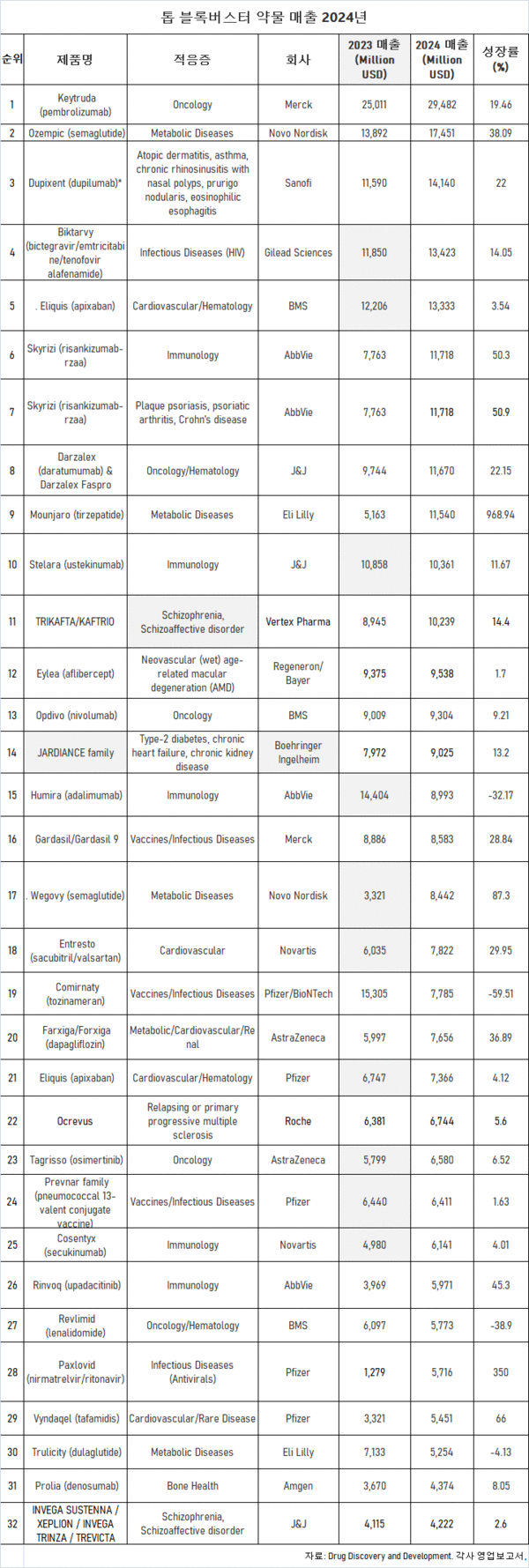 2024년, 톱 블록버스터 약물 사이에서 머크(MSD)의 키트루다(Keytruda)가 295억 달러의 매출로 계속 1위 자리를 지켰다.