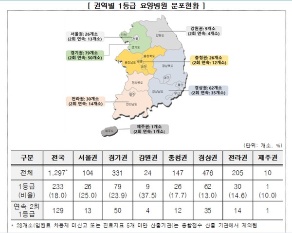 1등급을 받은 요양병원은 233개소이며, 이 중 2회 연속 1등급을 받은 요양병원은 129개소로 권역별로는 경기권, 경상권, 전라권 순으로 많았다.